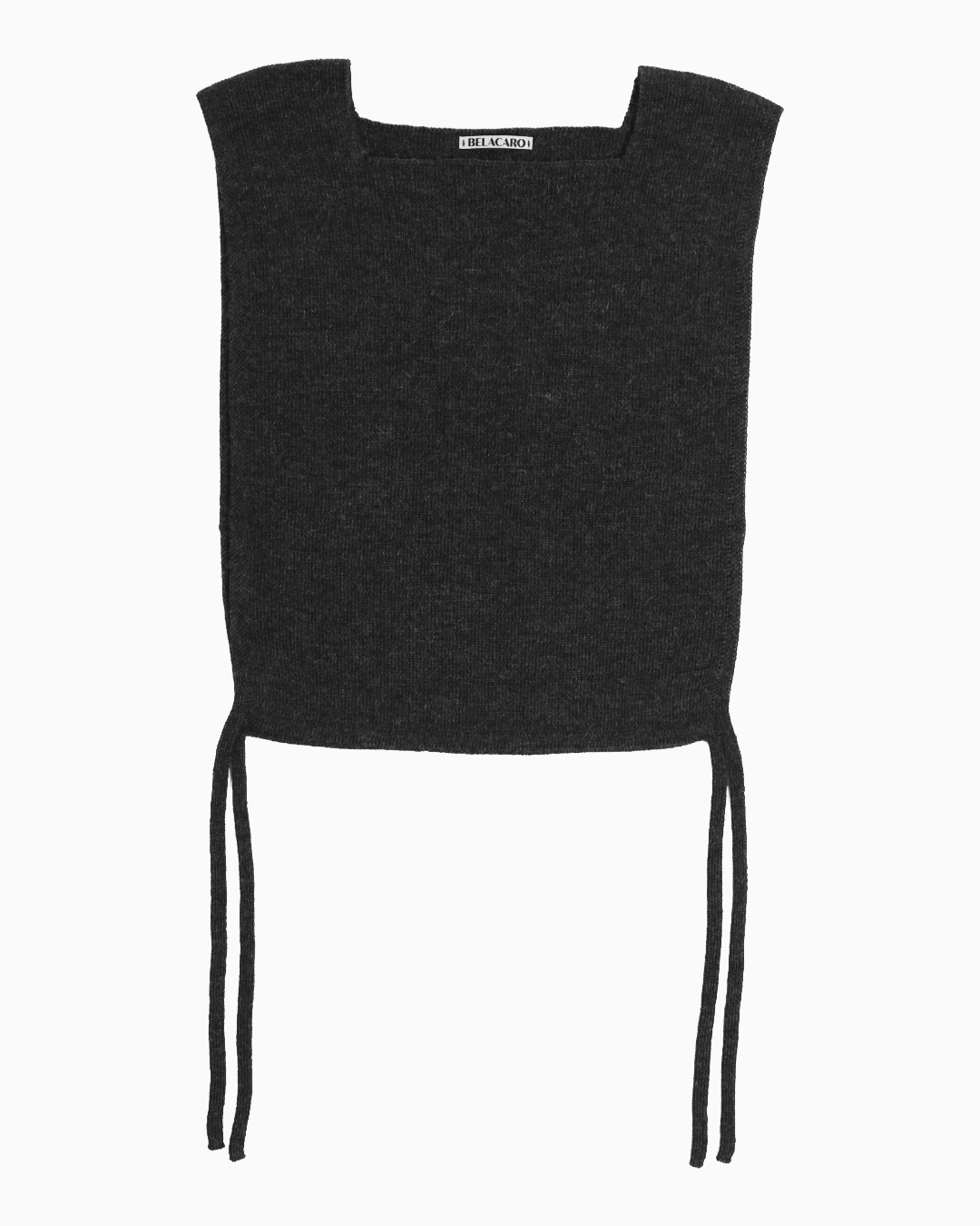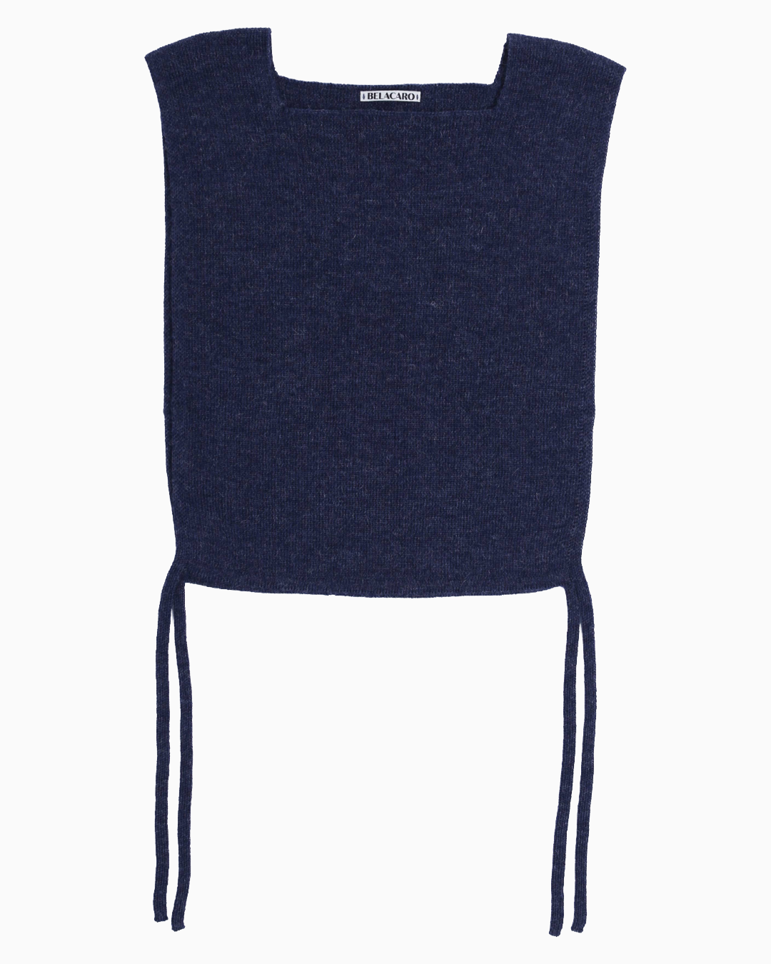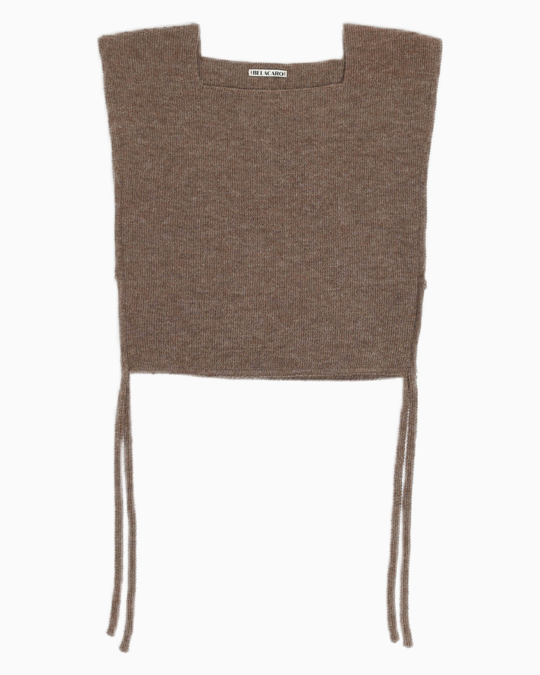 The apron top, designed for everyday wear, is made from baby alpaca — an exceptionally soft, warm, and breathable fiber, perfect for wearing on its own or layered. It fastens with a drawcord and a discreet button closure when needed. Multifunctional, this versatile garment is perfect for creating unique looks and adapts to any occasion.