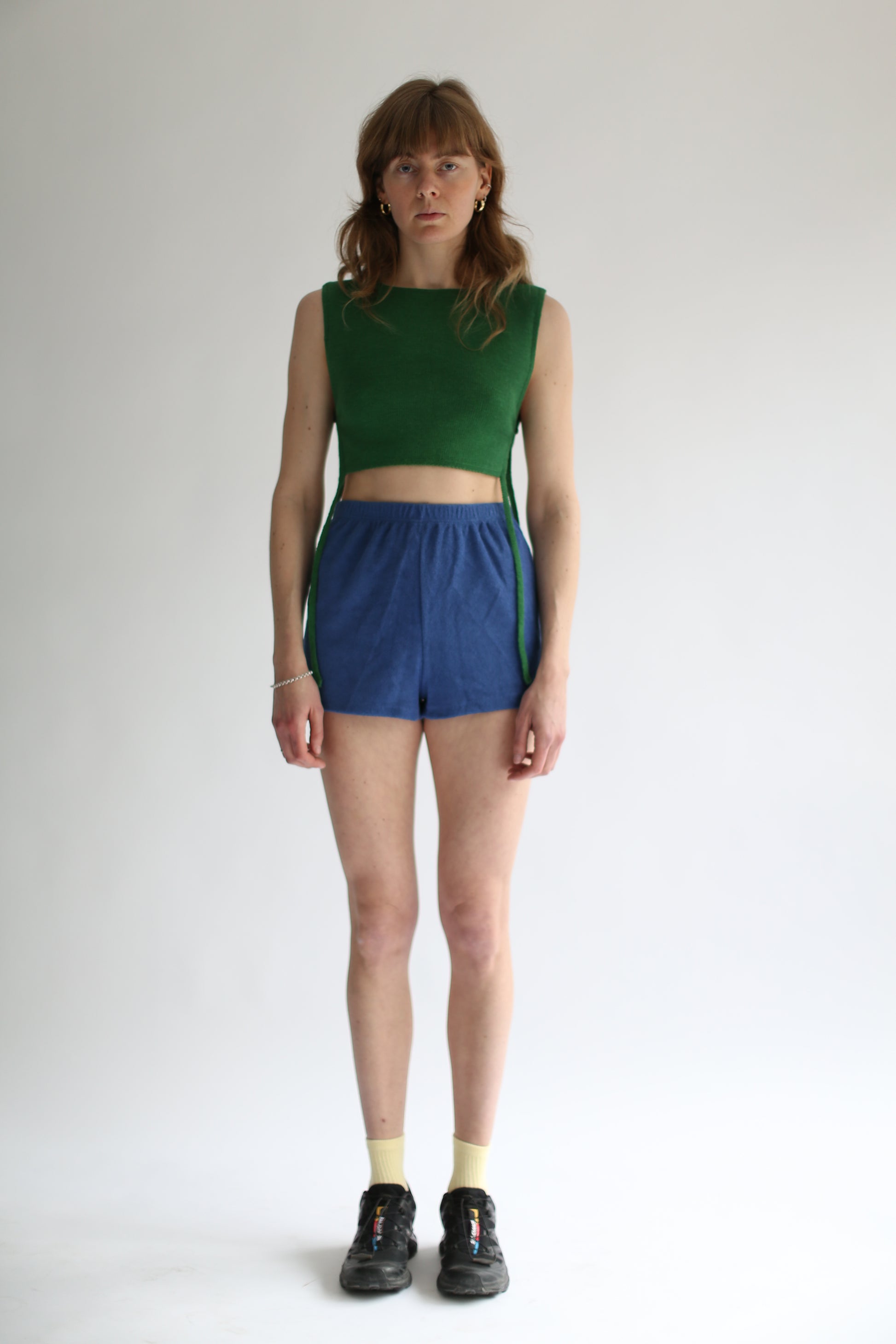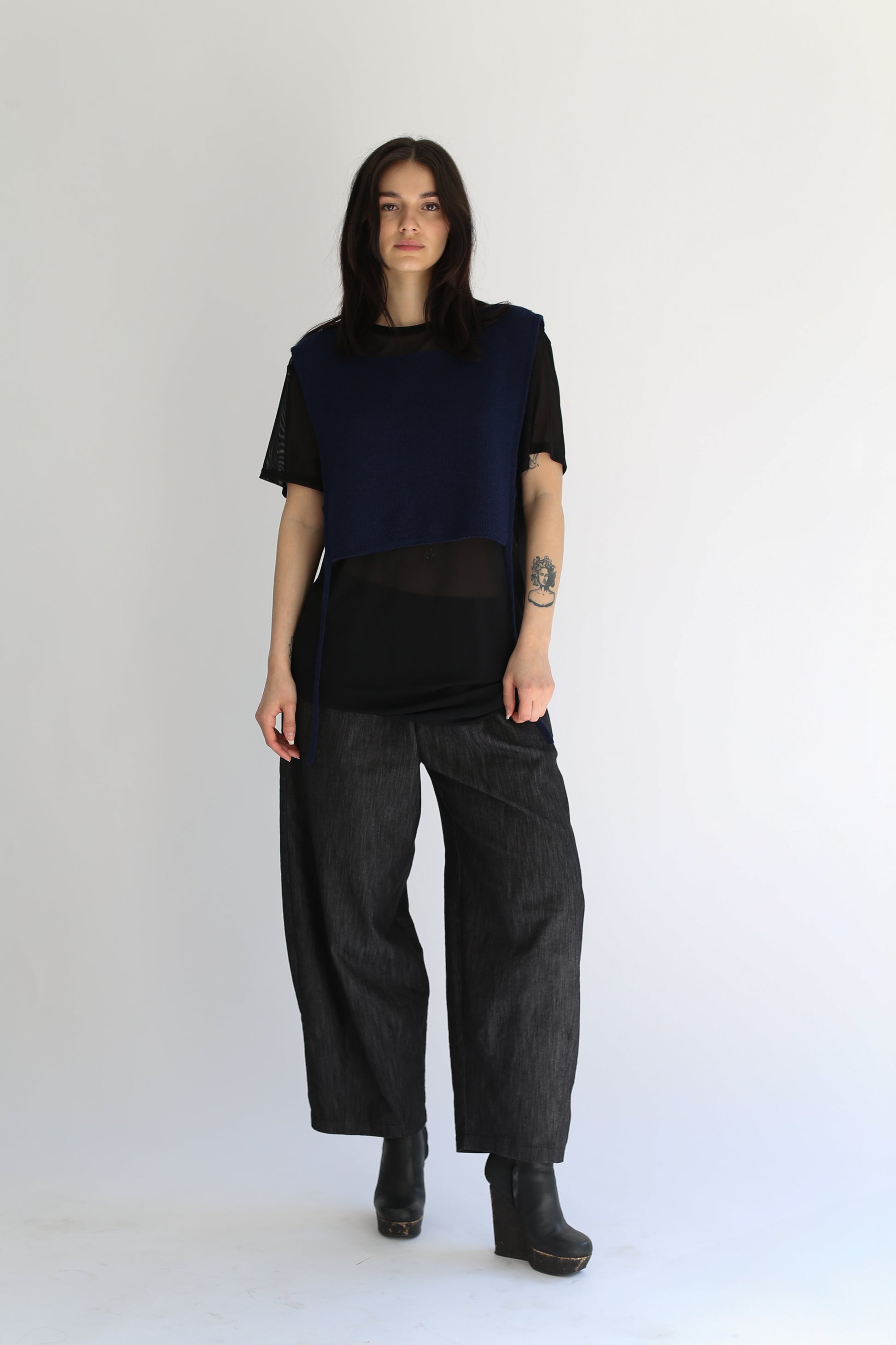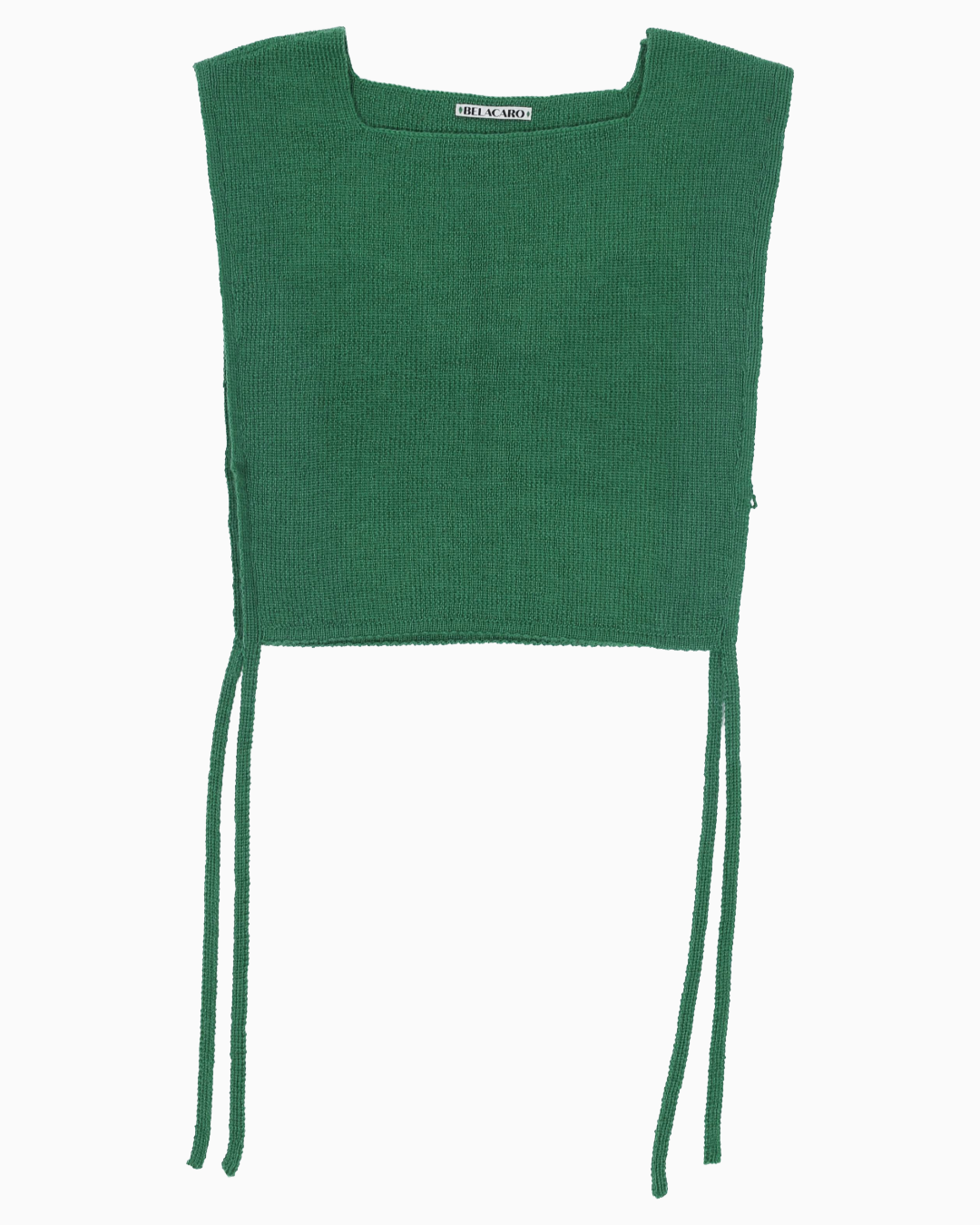The apron top, designed for everyday wear, is made from baby alpaca — an exceptionally soft, warm, and breathable fiber, perfect for wearing on its own or layered. It fastens with a drawcord and a discreet button closure when needed. Multifunctional, this versatile garment is perfect for creating unique looks and adapts to any occasion.